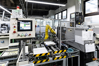 設備特有の機構である固定された工作物へ多加工をこなし、 工具自動交換機能を巧みに利用した生産効率による生産を可能としています。 工具以外にもブラシを取り付けることで最終仕上げを設備内で完成させる手法も取り入れています。 またロボットによる自動搬送装置を設備と一体化させることで完全自動生産を実現しています。