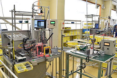 油圧ユニットの組立を半自動化し省人化による生産を可能としています。 多数組付けられる部材をカメラでチェックする機構を持たせており、組立品の保証制度とムダの無いレイアウトにしたセル生産をしています。