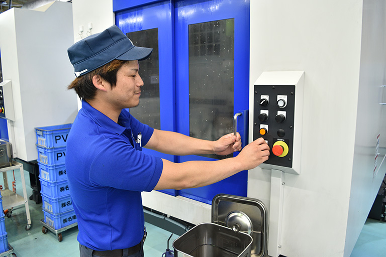 作業内容は製品の出来栄え確認、寸法チェック、刃物交換、段取り替えなどを行っています。